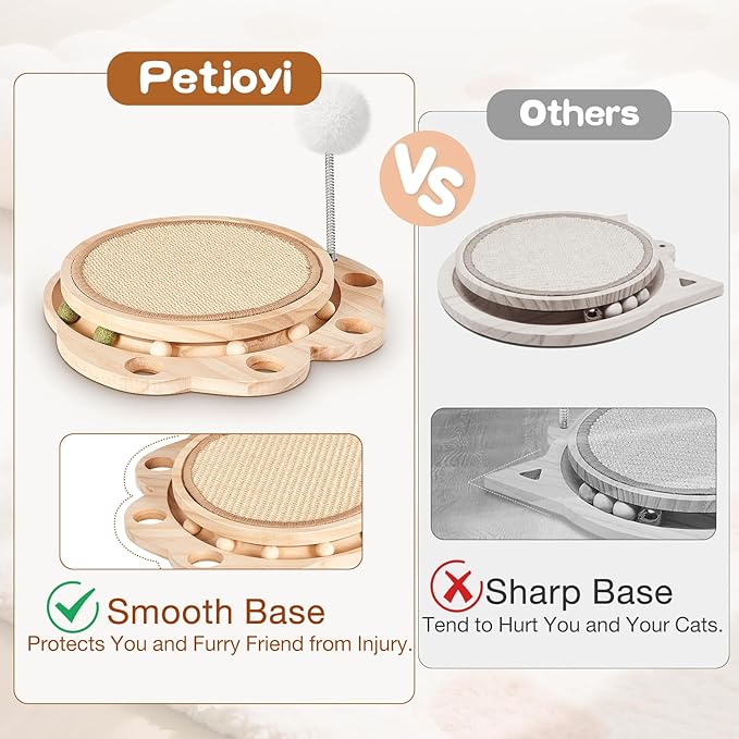 - 3-in-1 Cat Scratcher: Petjoyi cat scratching toys features a 2-tier ball track with scratching pads, 4 wooden balls, 2 catnip balls, and a detachable wand with bell. Your beloved cat can enjoy multiple fun games.