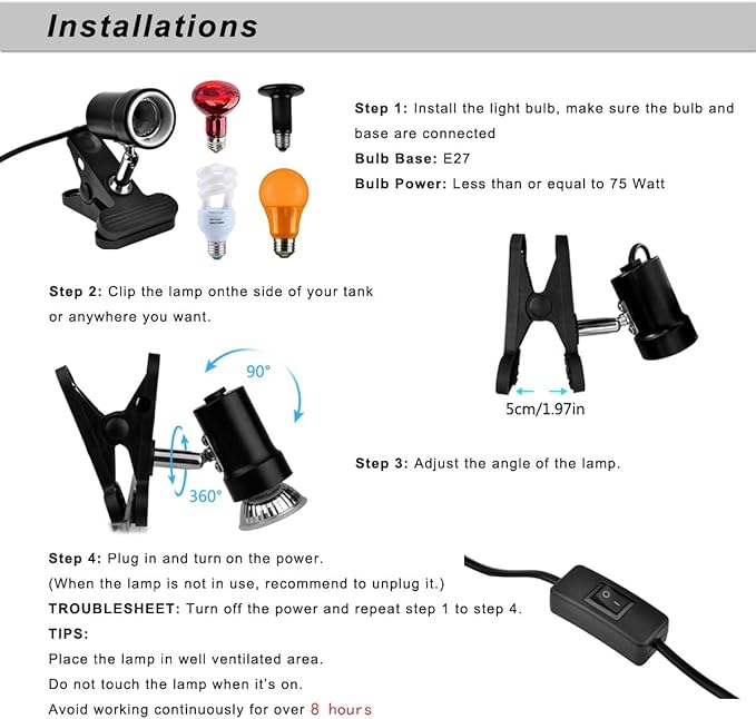 - 【Package】 Includes 1 * Heat Lamp , 1 * 50W E27 socket Bulb , 1 * 35W E27 socket Bulb(3000+ hours life certification). Cord length approx 4.59 FT. Clip opening up to 1 inch.