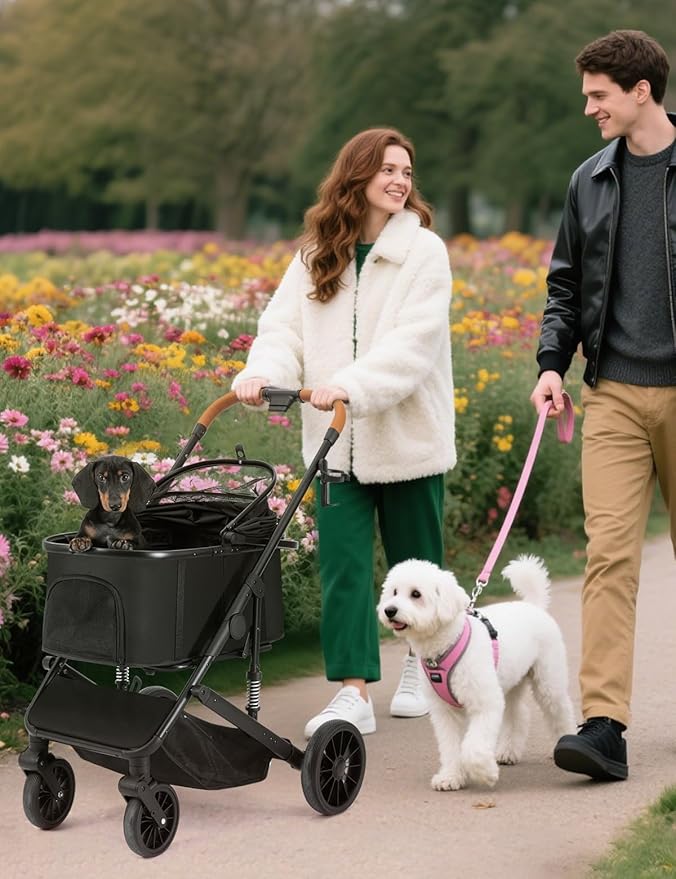 Dog Stroller for Small/Medium Dogs Up to 60lbs, 4 Wheels Folding Pet Stroller with Detachable Carrier, Pet Travel Carrier for Puppy & Cats, Storage Basket, Breathable Mesh, Black