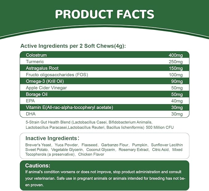 - NATURAL GENTLE FORMULA: Our Probiotics for dogs are made from the highest-quality all-natural ingredients in GMP-certified factories, including Omega-3, Colostrum, Turmeric, and Astragalus Root. Dog Allergy medicine is free from grains, soy, and artificial additives, gentle formula designed for sensitive pets