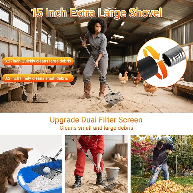 - 【Fine Mesh Design - Captures Small Droppings】 Unlike standard poop scoop, our 15" wide sifting shovel features tighter mesh to trap chicken poop, bedding, and even chicken dust bath residues. Nothing gets left behind!