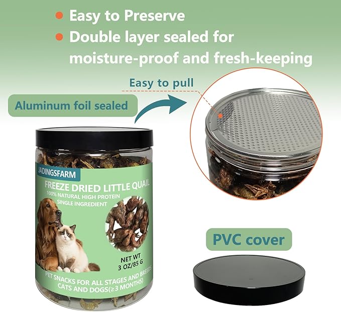 - Limited Ingredient Freeze Dried Quail: Jadingsfarm 100% natural premium freeze-dried little quail pet treat is rich in animal protein, providing a natural and healthy food option for your pets’ dietary needs