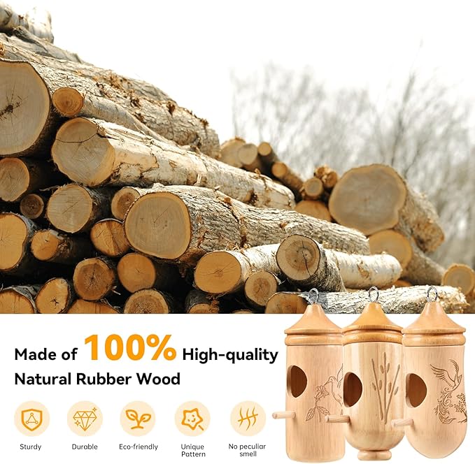 - ✅【Natural High Quality Rubber Wood】Made from premium rubber wood, our hummingbird house provides a warm and breathable home for hummingbirds, which they naturally love. Its environmentally friendly and durable properties ensure its long lifespan, while the beautiful wood grain adds a timeless charm to your garden, making it the perfect choice for attracting these lovely birds.