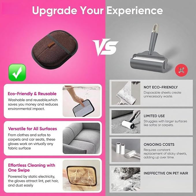 - 【Versatile Use on Multiple Surfaces & Hard-to-Reach Areas】Lint rollers for pet hair extra sticky Works effortlessly on pet hair embedded in clothing, beds, carpets, sofas, car seats, and narrow gaps. Save money on specialized tools – one glove cleans all fabrics from stubborn cat hair to dog hair on delicate upholstery, making it an excellent cat hair remover furniture tool