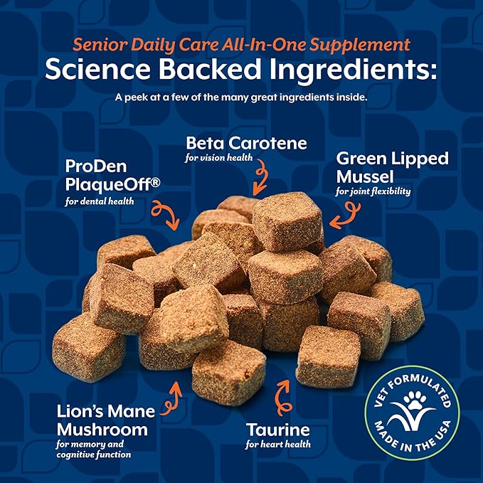- All-In-One Daily Care: Our daily care soft chews for dogs are formulated by trusted vets to help support your senior dogs with mobility, immune function, longevity, cognitive function, heart health, eye health, skin & coat, and dental care