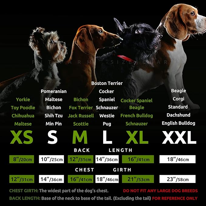 - FOR SMALL DOG BREEDS. Please priority follows the chest size. Size XL, fits 16" back, 21" chest. Recommended for: Beagle, French Bulldog, Schnauzer, Standard Dachshund, Corgi, and Goldendoodle.