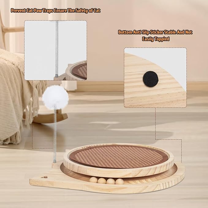 - Attention to detail: The cat scratching bottom base is made of natural pine wood, with four anti slip stickers is safe and stable, avoiding tipping and shaking. There is a transparent cover on the spring column to prevent cats' paws from getting stuck on it