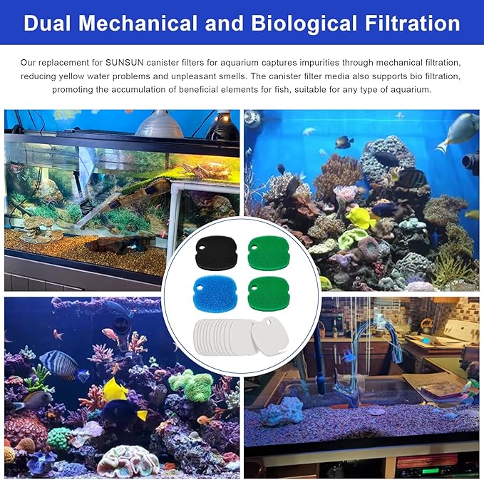 - 【Dual Mechanical and Biological Filtration】Our replacement for SUNSUN canister filters for aquarium captures impurities through mechanical filtration, reducing yellow water problems and unpleasant smells. Replacement for SUNSUN filter media also supports bio filtration, promoting the accumulation of beneficial elements for fish, suitable for any type of aquarium.