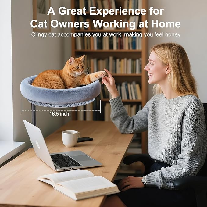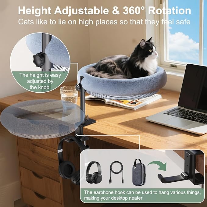 - 【360° Rotation & Adjustable Height & Headphone Hook】Enjoy a 360° rotating and height-adjustable stand, allowing cats to lounge and look around your workspace comfortably. The hooks on the stand can help you tidy up your messy desktop, allowing you to store your headphones, charging cables and other things, making your desktop look neat and tidy