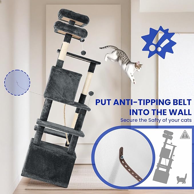 69-Inch Tall Cat Tree with Huge Condos, Multi-Functional Cat Tower with Top Perches, Scratching Posts, Pompoms, for Climbing, Lounging and Playing (Dark Grey)