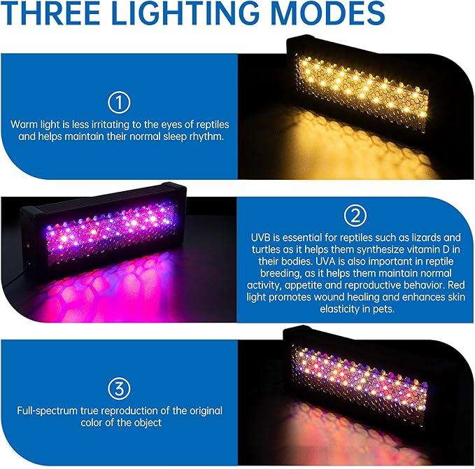 - [Smart Ecosystem Simulation, One-Touch Setup] This full-band UVB lamp for reptiles is a smart addition to your chameleon's cage accessories. It features multiple preset modes that simulate natural light from dawn to dusk, helping your pet maintain a healthy circadian rhythm. Even when you're away, this reptile-specific UVB lamp ensures your pet maintains an ideal habitat.