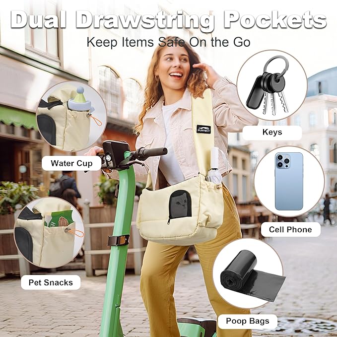 - [Hands-Free Carry with Drawstring Pockets] Compared to typical cat carriers with limited or no storage space, the Furtent cat carrier pouch features two large side pockets with adjustable drawstring closures. These offer flexible storage for snacks, water bottles, waste bags, keys, and even a phone. The drawstring design prevents items from getting lost, and the contrasting color scheme adds a touch of style, allowing you to go hands-free while walking with your pet, traveling, or shopping.