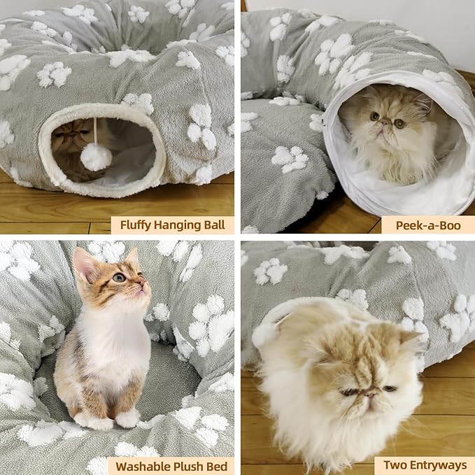 Homimp Cat Tunnel Bed with Central Mat,Large Tube Playground with Plush Ball Toy,Peekaboo Cat Cave with Washable Circle Cushion for Indoor Cats,Pop Up Bed HidePlace for Kitten Puppy Rabbit, Grey Paw