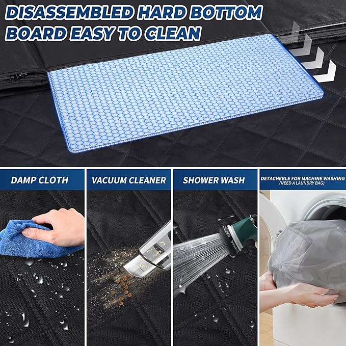 - EASY TO CLEAN & EASY TO INSTALL - Removable board design, our dog car seat cover hard bottom is machine washable, or simply wipes clean. Simply unfold our dog back seat cover in car, secure the buckle, and clip the straps to the headrest for a hassle-free setup.