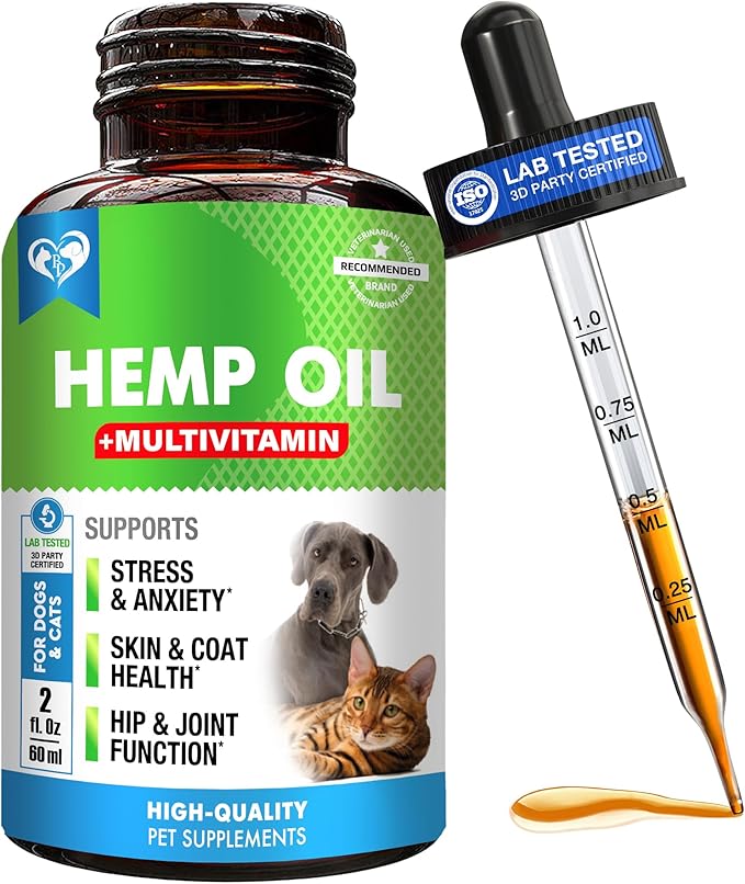 Cat & Dog Hemp Oil Drops with Multivitamin - Pet Calming Anti Anxiety & Hip and Joint Pain Aid and Anti Stress Support - Natural Liquid Supplement (2 oz)