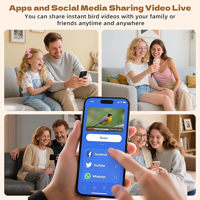 - Video Live Streaming - Recording and Sharing: This video bird feeder can watch bird live broadcasts in real time and record videos. It can be shared through social media or apps, or shared with your parents, children, and friends, allowing everyone to experience the fun of bird watching together!