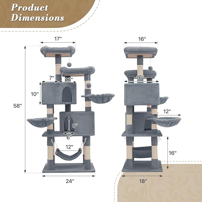 - Plenty of Vertical Space: This 58 inches tall cat tree designed invites climbing and jumping, letting your cat stay active and enjoy their natural instincts.