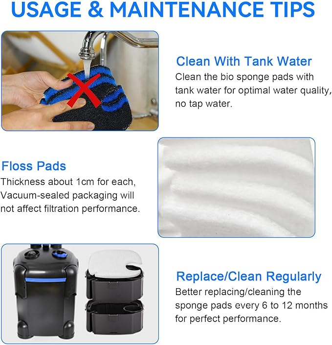 - Tips for Maintenance:✔Resine the bio sponge pads with tank water for optimal water quality, do not use tap water.✔Replace or rinse sponge pads every 6 to 12 months for optimal performance✔Better replace the white polishing pad every 2 to 6 weeks.