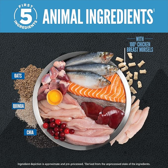 - High-protein dry dog kibble made with fresh or raw poultry and fish as the first 5 ingredients*, including Chicken, Turkey, Chicken Giblets, Whole Herring and Salmon