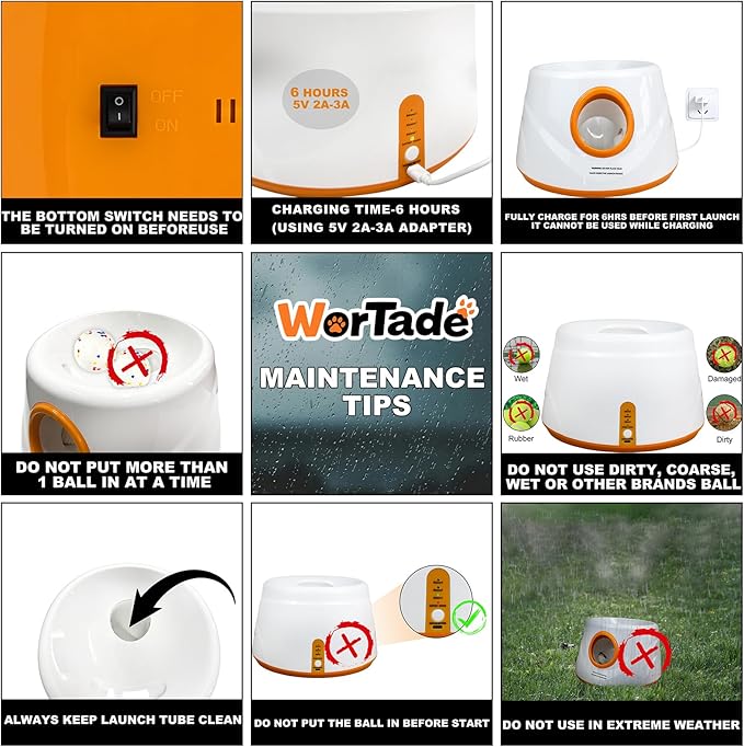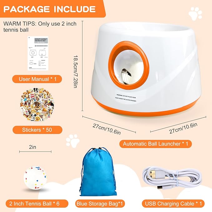 - ⚠️ Note: It is recommended to use a 5V2A charger to charge the automatic dog ball launcher. Please read the instruction manual thoroughly before use. In addition, we do not recommend this ball toss machine for timid dogs to prevent them from being frightened. If you need any assistance or have any questions during use, please feel free to contact us, and we will provide satisfactory solutions in a timely manner.