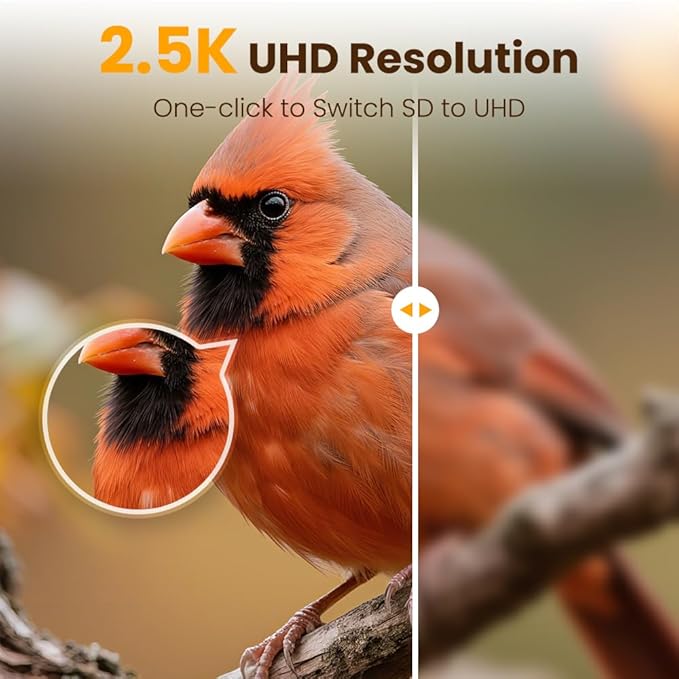 - Immersive 2.5K HD Bird Video. Discover a whole new way of bird watching with the bird feeder camera! Enjoy crystal-clear 2.5K high-definition views of the birds, revealing every detail of their beautiful plumage. The 130° adjustable vertical angle lets you choose the perfect viewing angle for an unobstructed look at the feeding area. Even at night, the colorful night vision keeps your bird watching adventures going. And with the two-way audio function, you can listen to the birds' chirps and calls as if you were right there.