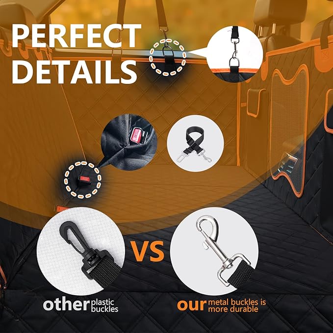 - Waterproof & Anti-Slip Design:Made with 7 layers of protection—including 600D and 210D Oxford fabric—and sealed using advanced heat-pressing technology, this back seat cover delivers exceptional waterproof performance. The non-slip base ensures the cover stays firmly in place while your dog moves.