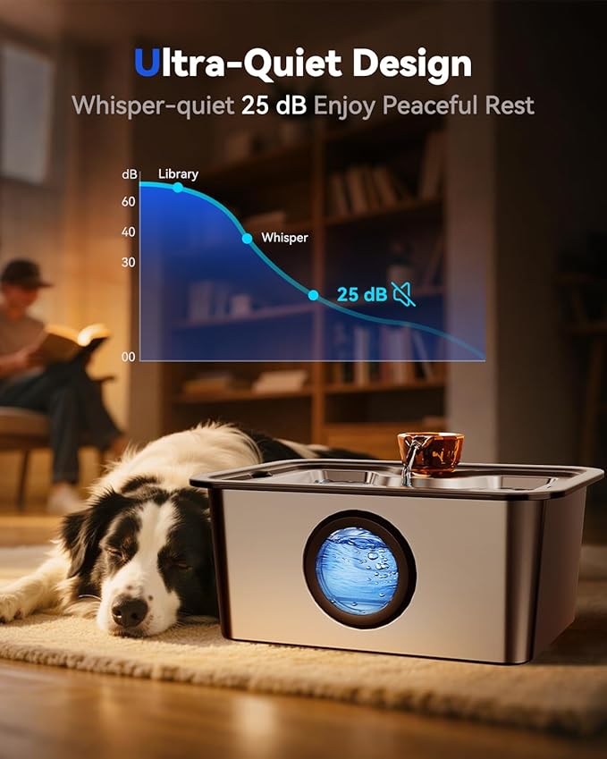 - Ultra-Quiet Pump & Smart Light Reminder: Featuring a whisper-quiet pump operating at just 25dB, this dog water bowl fountain ensures a tranquil environment for both you and your pets to rest undisturbed. Its powerful circulation system delivers a steady flow of fresh water while keeping it optimally oxygenated. With a 2-meter power cord, it's perfect for indoor or outdoor use - place it in the yard to keep your dog hydrated after outdoor play. The built-in smart indicator light changes from white to red when water runs low, serving as a timely reminder for refills.