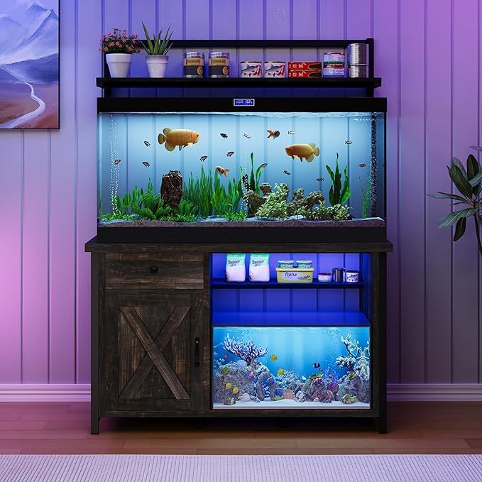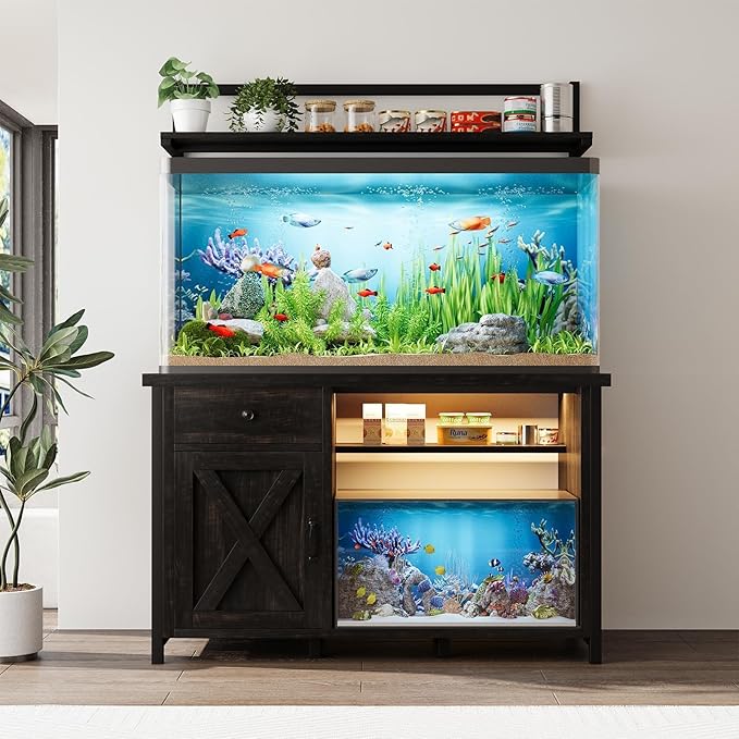 - Nighttime Mood Maker: This aquarium stand features RGB LED lights, which can be controlled by a remote control for color and flashing patterns, bringing a touch of elegance to ordinary evenings. The barn door adds a farmhouse-like ambiance, making it a perfect finishing touch to your home