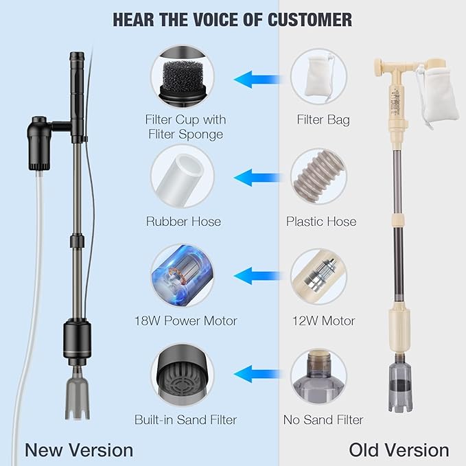 - UPGRADED 18W MOTOR WITH STRONG SUCTION: Equipped with upgraded18w powerful pump motor, the fish tank vacuum has stronger suction capacity while working. It not only helps you change the water and add water quickly and time-saving, but also makes it more thorough while suck up dirt or impurities in the fish tank. Our pump motor is mounted in the end position and you can use it to clean low water tanks. (The sand wash start must be above 15cm)