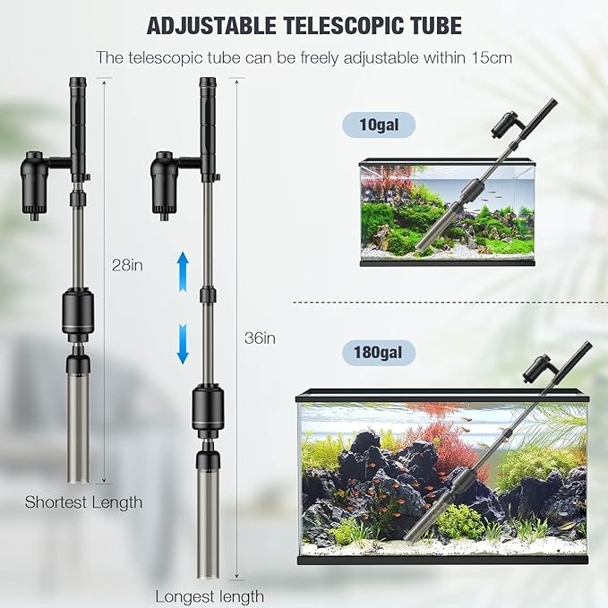 - ADJUSTABLE DESIGN FOR VARIOUS FISH TANKS: Equipped with 15cm adjustable telescopic rod and an extended 1.5m water hose, the total length of our fish tank gravel vacuum tube can reach up to 35.8 inches. The tube can be extended from 27.95 to 33.6 inches, therefore you can adjust the height according to different fish tank size or the water level. It makes fish tank cleaning easier and is an indispensable good partner in your daily life