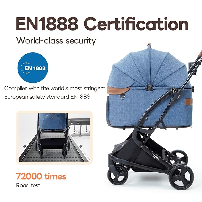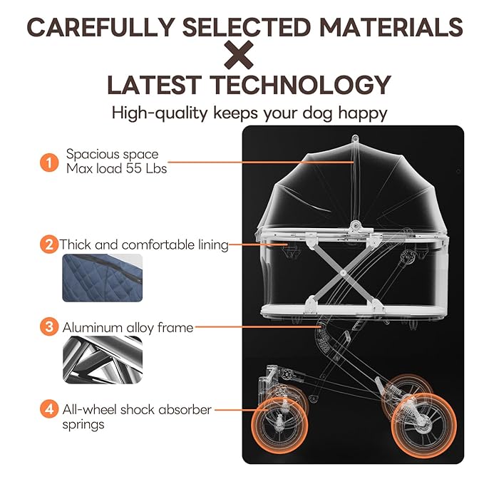 - ๐ใLarge All-Terrain Wheelsใ PETTENA pet stroller for small dogs has upgraded EVA 6.89" large rear wheels, can easily pass through sand, gravel roads and speed bump, ensuring a comfortable ride for your furry friend on any path. Besides, it equipped with 4-wheel shock-absorbing spring system, which can travel easily on bumpy roads and provide excellent stability.