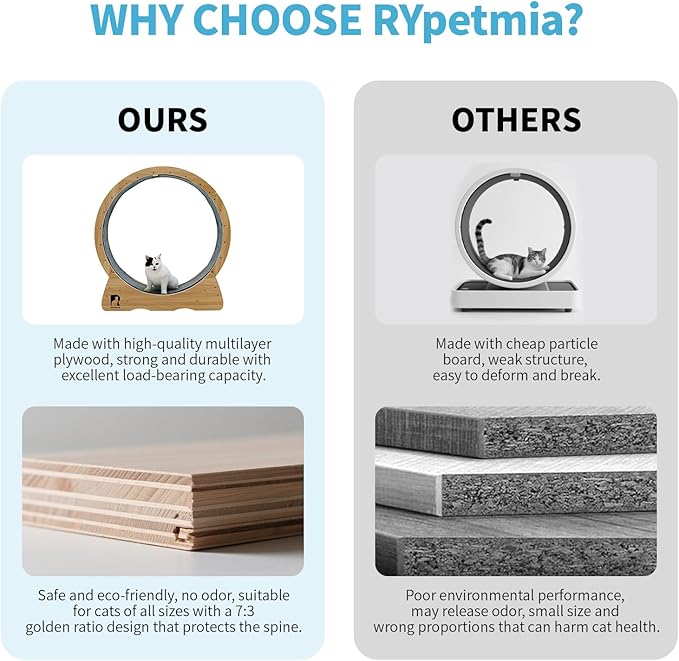 - Durable Plywood Construction — Built from high-quality multilayer plywood, this cat wheel offers superior strength and durability compared to plastic alternatives. The sturdy frame and reinforced base ensure long-lasting use for daily cat workouts.