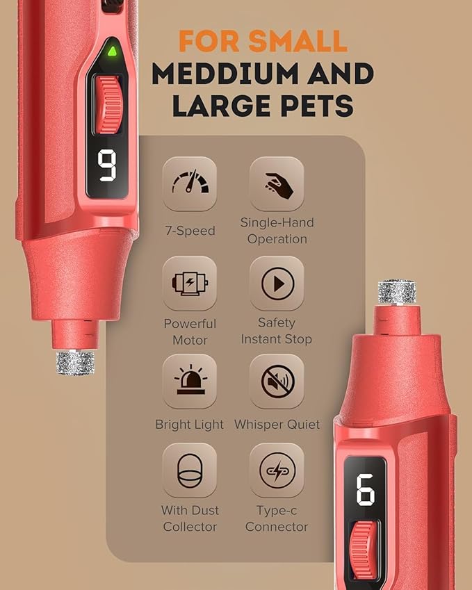 - INCLUDES DUST COLLECTOR: No more mess! The dog nail grinder features a built-in dust collector to keep nail filings contained, providing a tidy grooming session for both you and your pet.